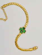 Brighten your everyday look with this lucky stunner. The Golden Leaf Heart Charm Bracelet features a gold Cuban-style chain and a clover charm crafted from four sparkling heart-shaped emerald stones. This charm bracelet blends bold structure with feminine detail—perfect for lovers of Montreal minimalist jewellery and timeless elegance. It's become a clean girl staple across Canada.